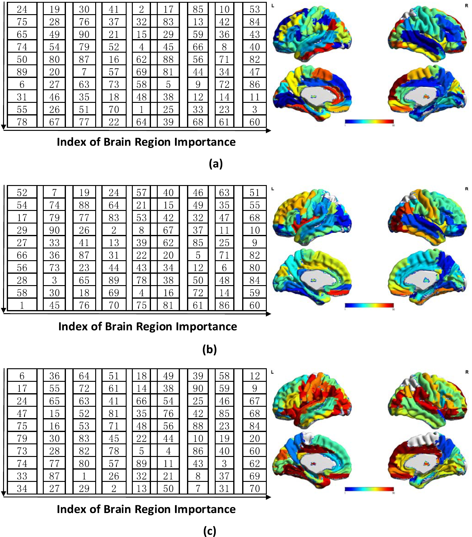 Fig. 5. Index of brain region importance and corresponding visual representation on the baseline data (Note that the importance of brain regions is sorted from top to bottom and left to right in the left table).