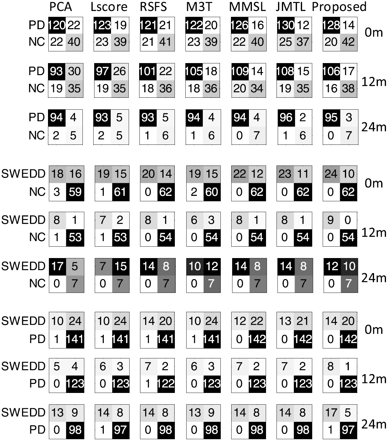 Fig. 3. Confusion matrices for the competing approaches on longitudinal data.