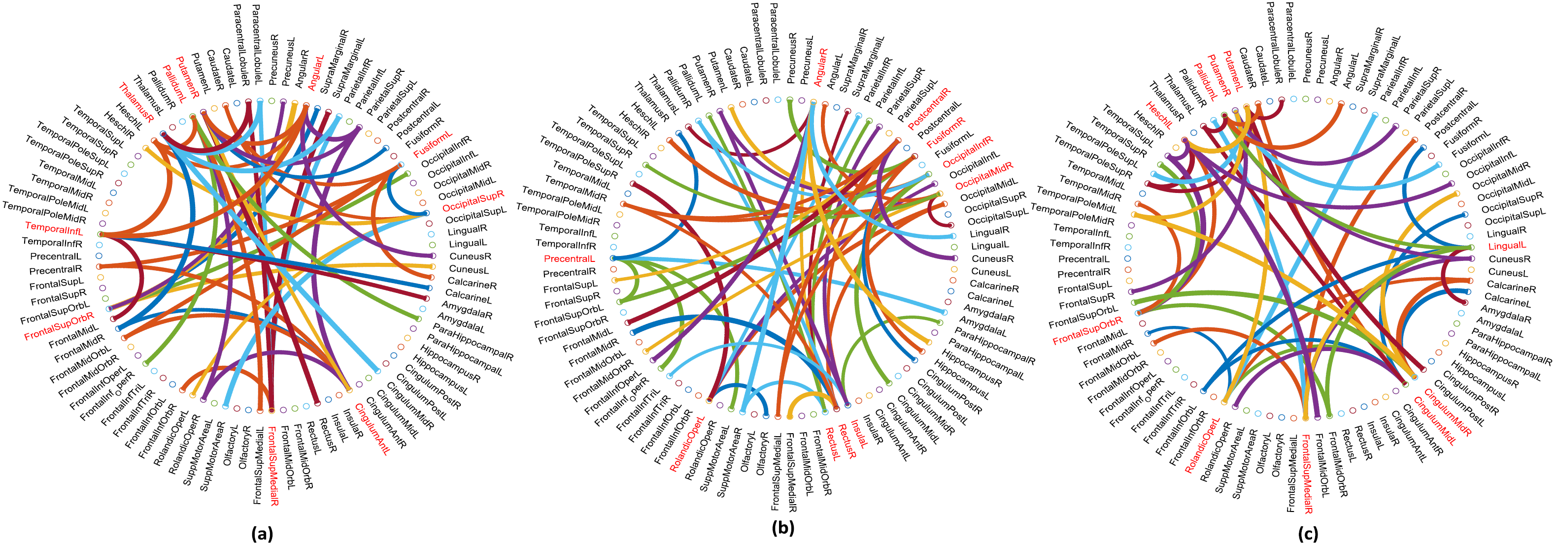 Fig. 6. Correlation maps between top ten brain regions with red fonts and other brain regions with black fonts on the baseline data.