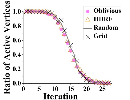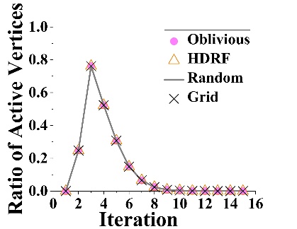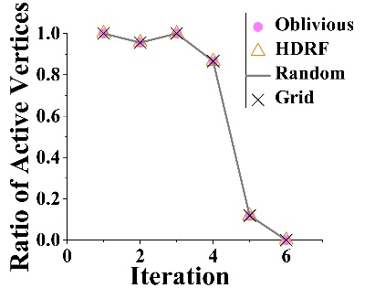 Fig. 3: Convergence analysis of PageRank, SSSP and SI under different strategies. The convergence speeds under the four partitioning strategies are exactly the same for SSSP and SI.