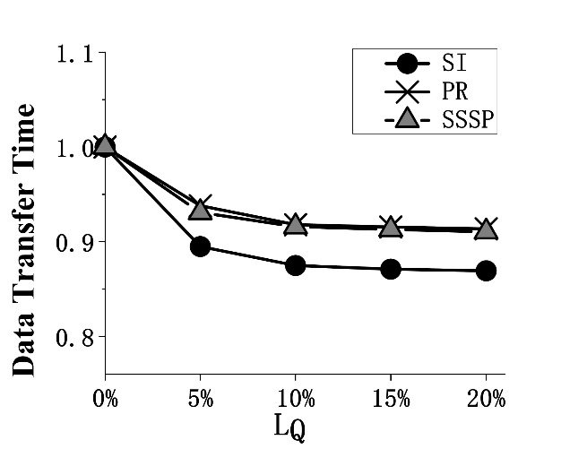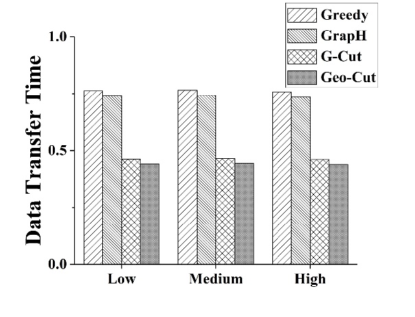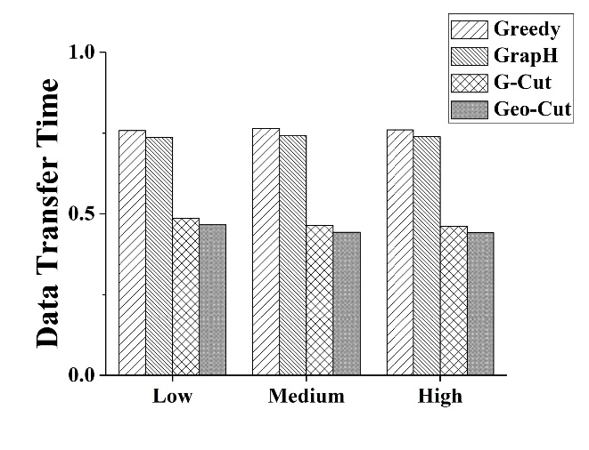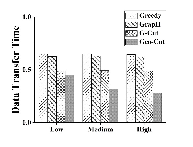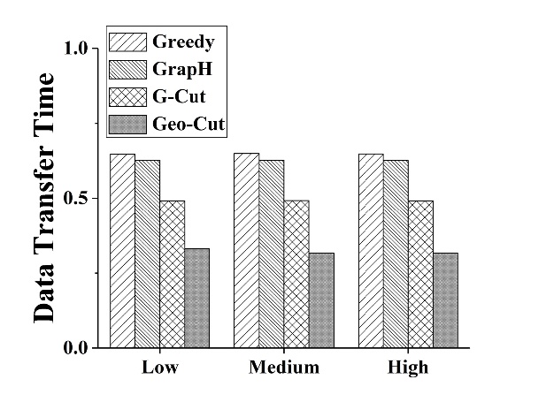 Fig. 15: Normalized inter-DC data transfer time under different bandwidth heterogeneities using Livejournal.