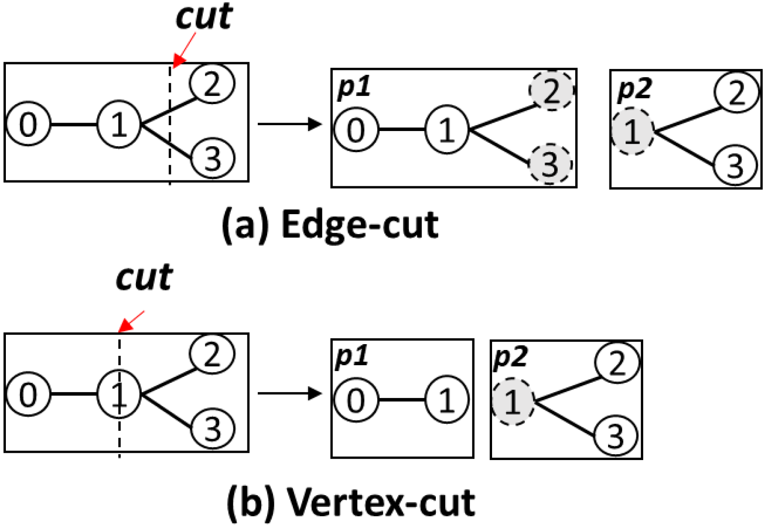 Fig. 1: Illustrations of (a) edge-cut and (b) vertex-cut. Shaded vertices represent ghosts and mirrors respectively.