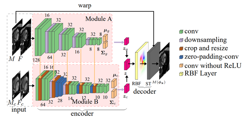 图 1 NetGI 的网络结构。编码器包括了模块 A 和模块 B。模块 A 和模块 B 分别估计全局控制点和 中心局部控制点的系数分布参数。解码器由 RBF 形变层和 STN 组合而成。M 和 F 是模块 A 的输 入,而裁剪后的图像对 Mc 和 Fc 是模块 B 的输入。