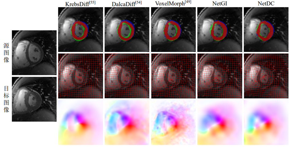 图 3不同网络的配准结果。左边第一列从上到下分别是源图像和目标图像。右边五列从上到下分 别是:使用对应方法生成的形变后的源图像,DVF 网格图和 DVF 可视化图。在形变后的源图像上, 绿色表示目标图像的心肌分割,蓝色表示形变后的源图像的心肌分割,红色则代表两者的重叠区域。