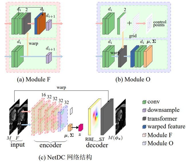 图2 用于实现带有偏移控制点的 RBF 形变的网络 NetDC。NetDC 以由目标图像 F 和源图像 M 组 成的图像对为输入。NetDC 的编码器由 4 个模块 F 和一个模块 O 组成。模块 F 分析图像对之间对应 关系的特征和控制点偏移特征。模块 O 输出控制点偏移和对应的系数。