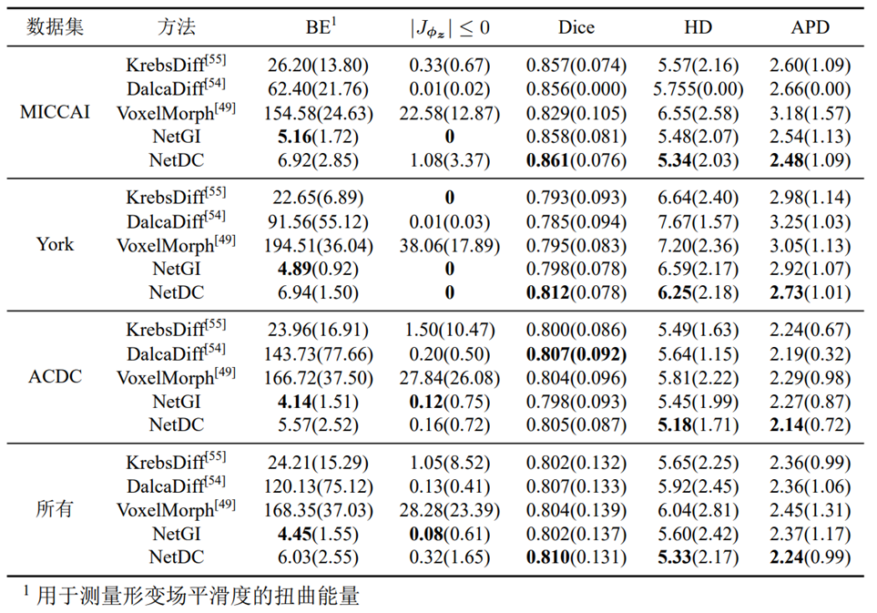 表1 不同方法的 Dice、HD、APD、BE(×10−4)以及雅可比行列式小于零的数量(|Jϕz | ≤ 0)的 平均值和标准差结果。